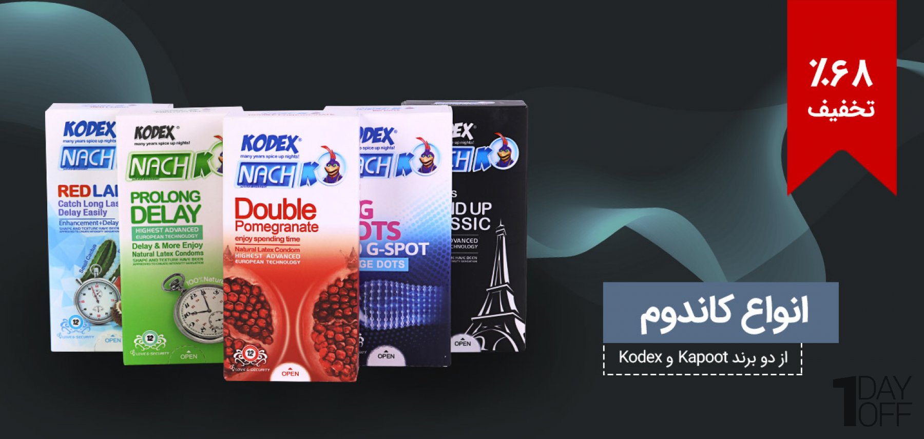 نمایش محصولات مرتبط با پروموشن انواع کاندوم از دو برند Kodex و Kapoot